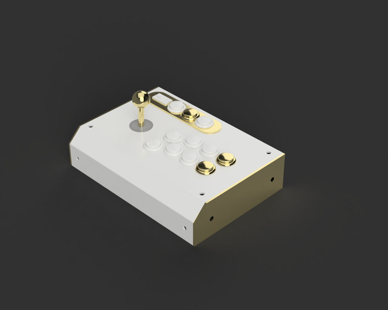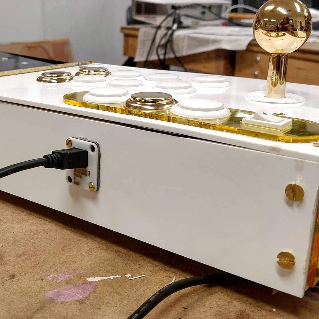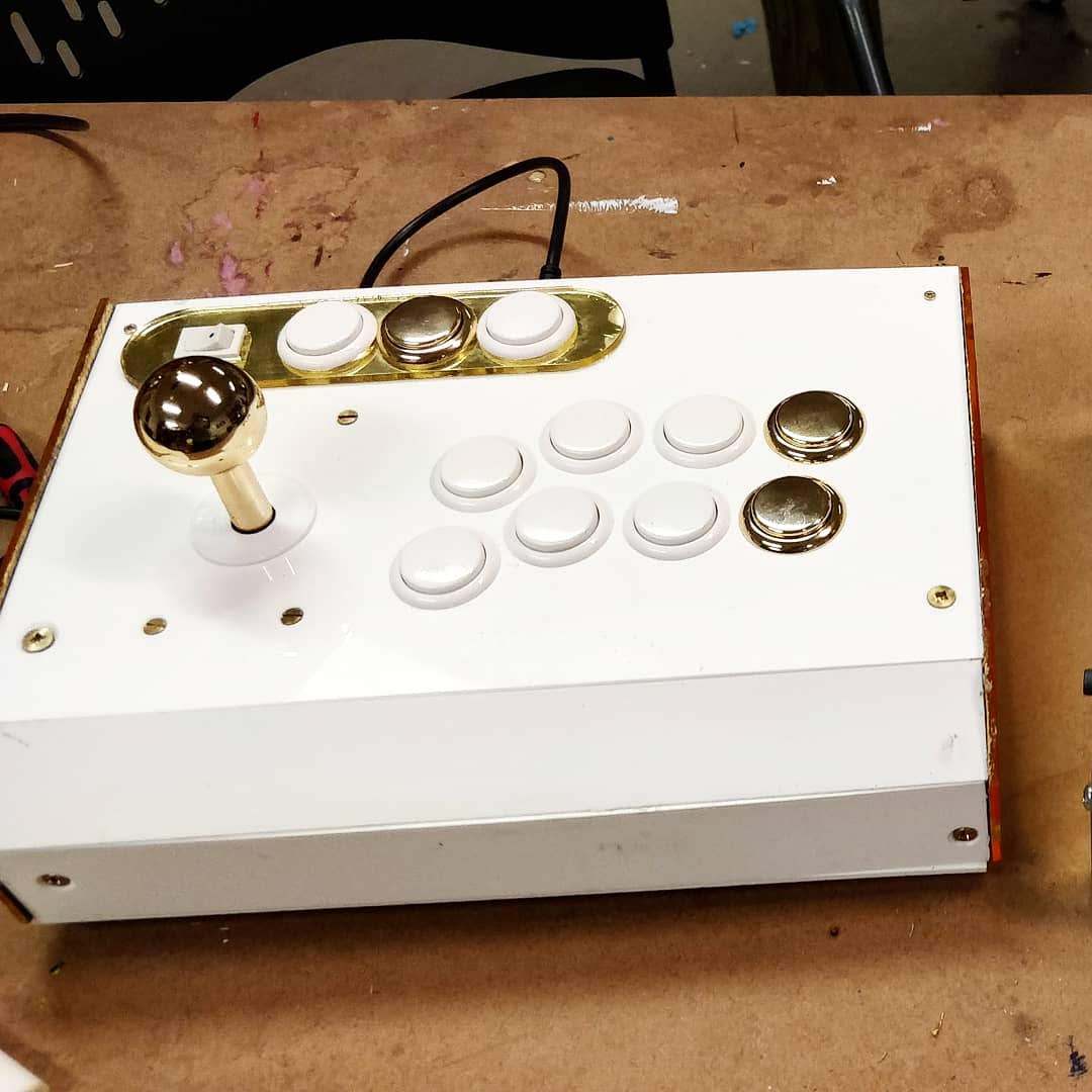 White and mirror gold acrylic arcade stick with brook universal board. All acrylic panels, with custom 3D printed brackets holding parts together