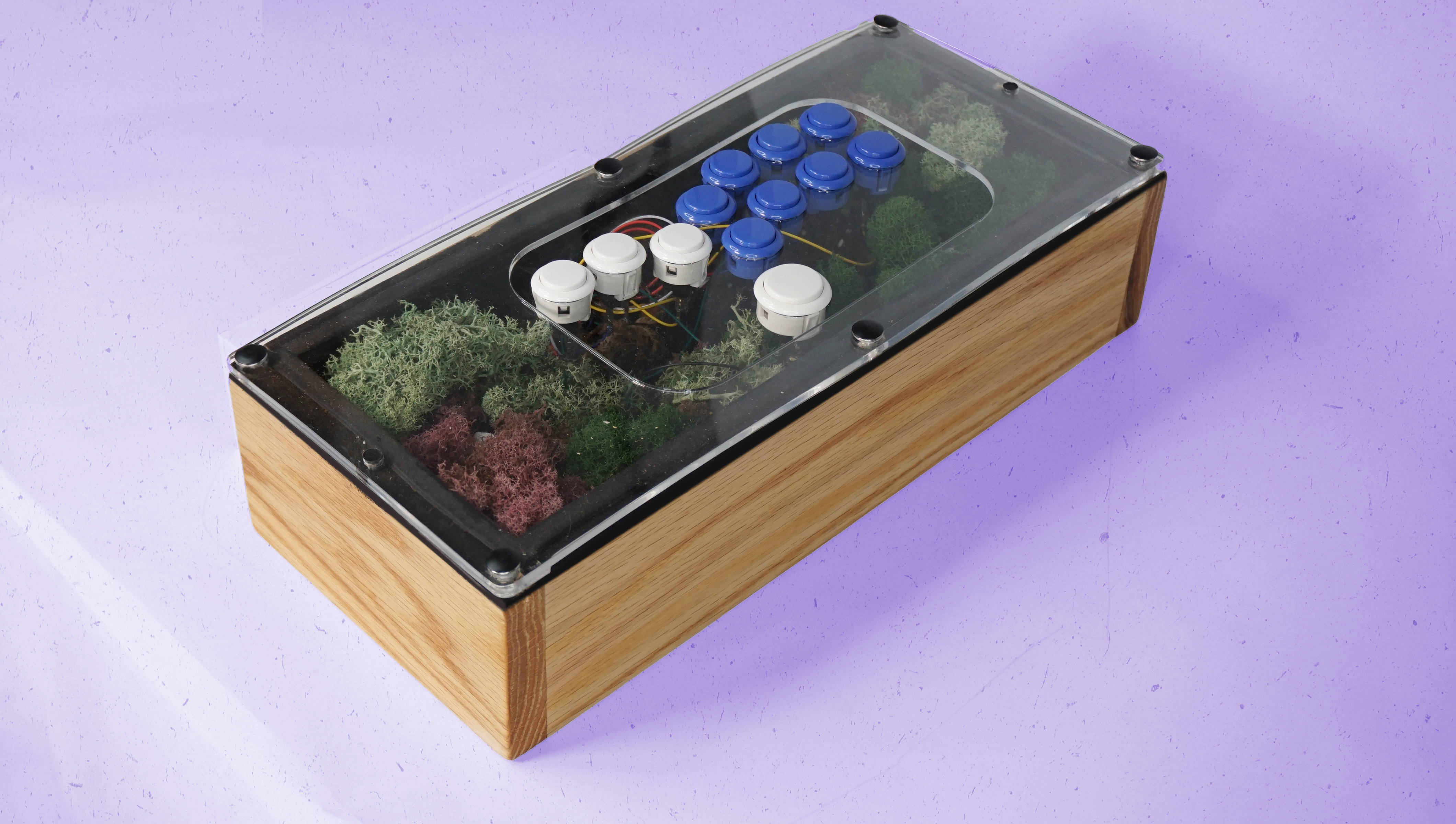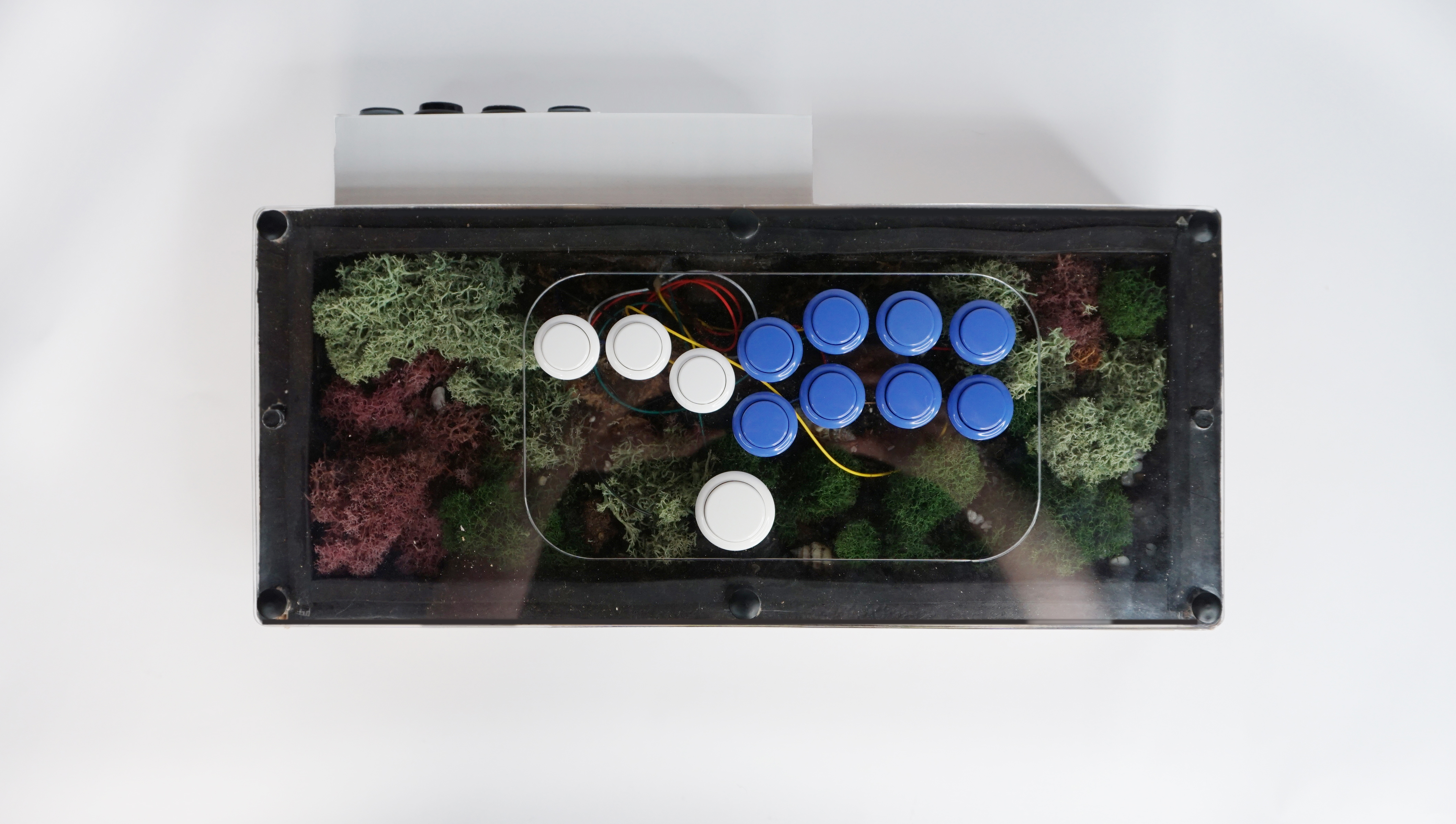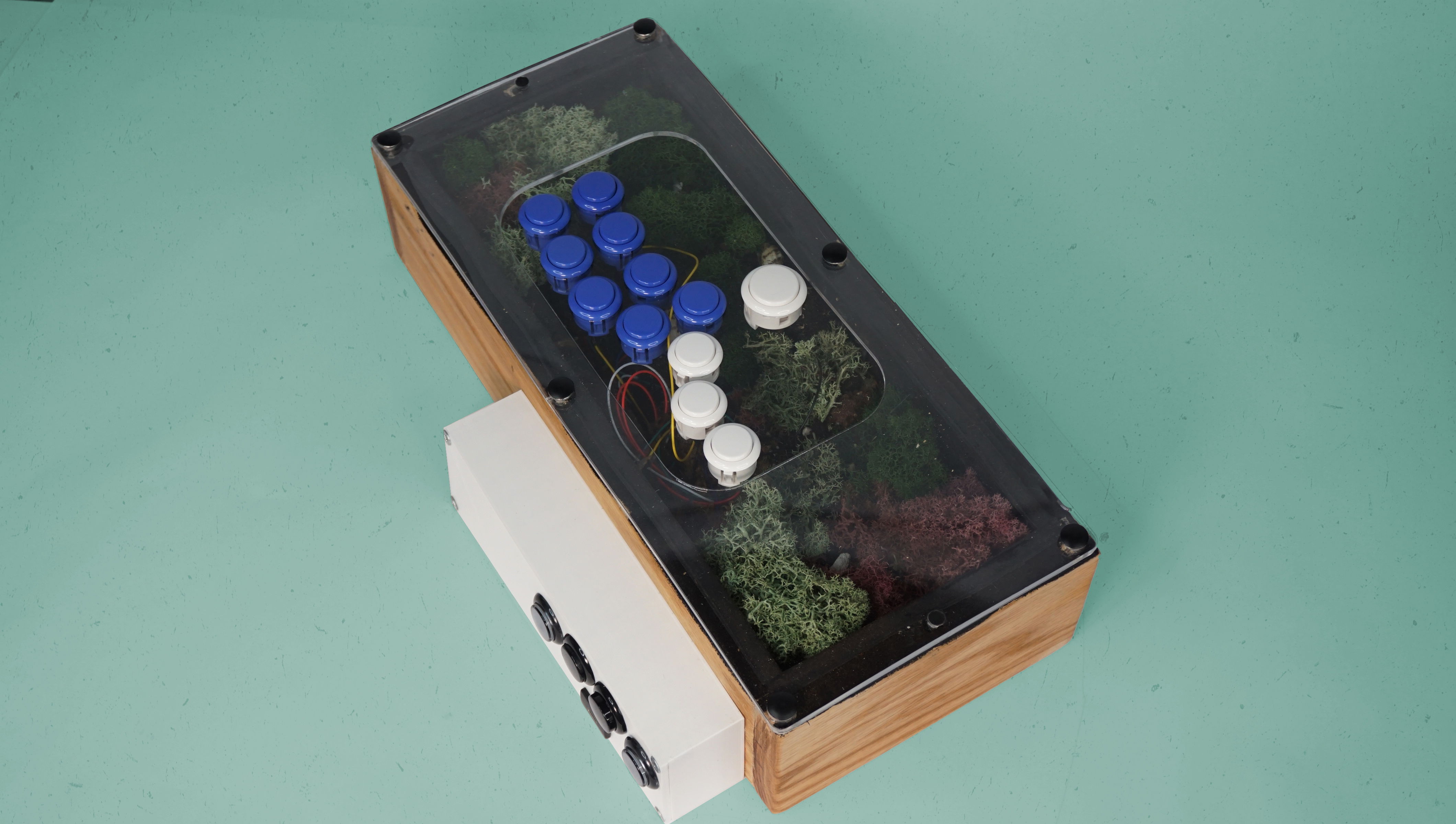 A living, self sustaining moss terrarium built inside of a functional hitbox style arcade controller