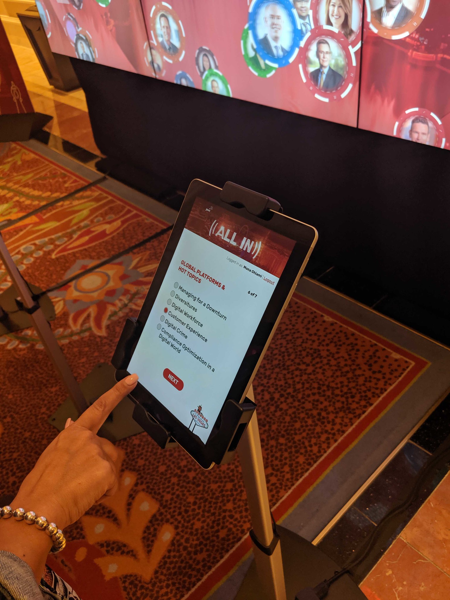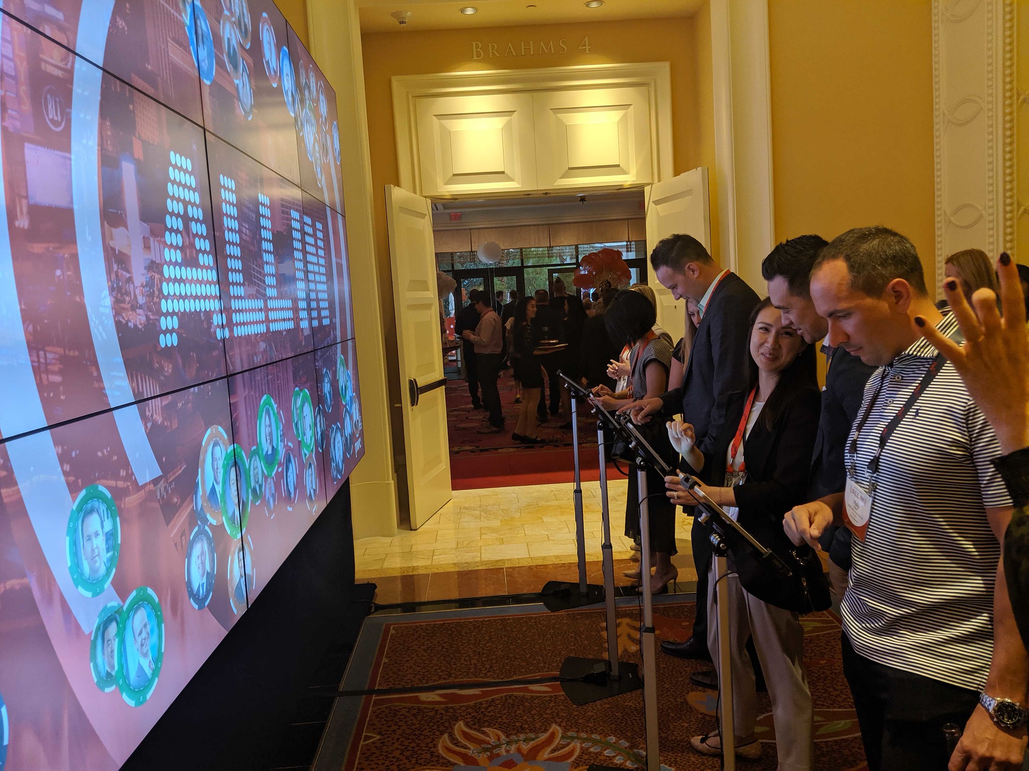 Guests answer a series of questions to have their traits, personalities, and interests matched with other conference atendees. Atendees that complete assessments on the provided tablets will see an animation showing their top 5 matches play on the video wall set up in the main conference hall. Animations and all activity on screen written in Processing 3, communicating with a client designed back end. Made in collaboration with wonderMakr